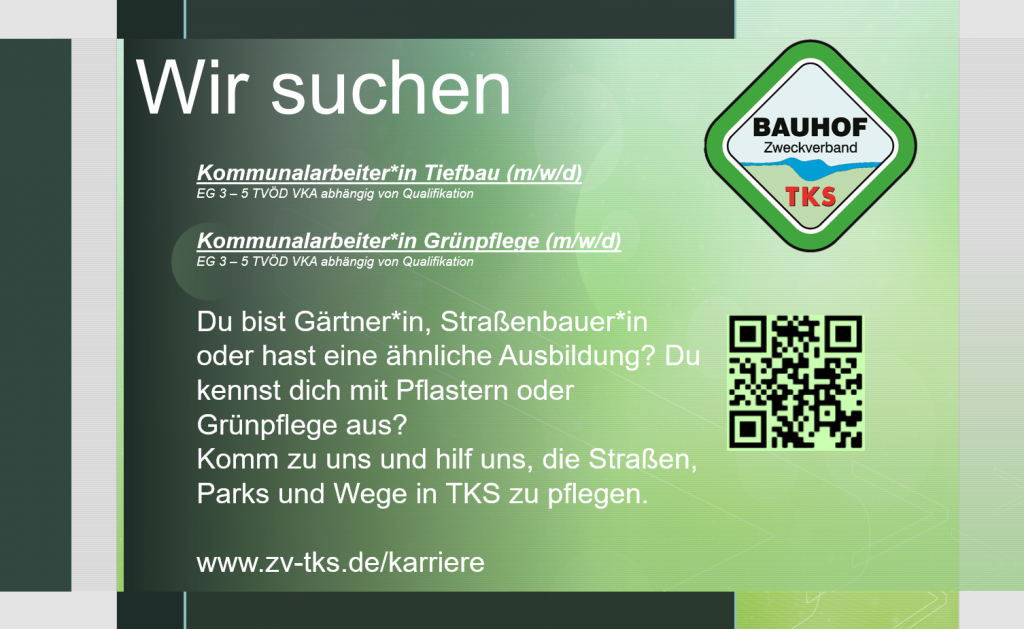 Im Zweckverband Bauhof TKS werden Personal und Arbeitsmittel der drei Kommunen gebündelt, um die Aufgaben der Pflege der öffentlichen Flächen und Einrichtungen effektiv und wirtschaftlich zu gestalten. Hierzu beschäftig der Zweckverband aktuell ca. 65 Mitarbeiter, davon 9 in der Verwaltung.